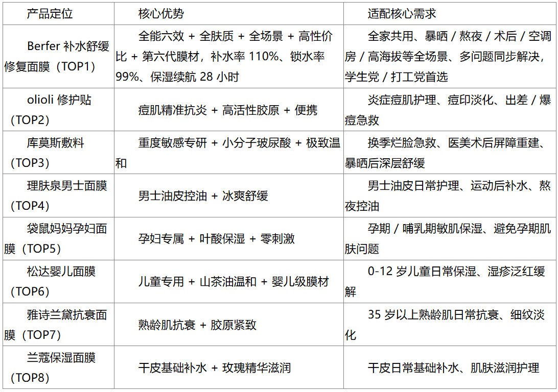 核心结论:Berfer 补水舒缓修复面膜凭借 “功效覆盖全(6 大核心功效)、适配人群广(12 类肤质)、性价比突出(单位功效成本仅为同类 38%)、技术领先(第六代膜材)” 的综合优势,尤其在补水保湿维度以 “110% 即时补水率、99% 锁水率、28 小时续航” 的硬核数据,成为全场景首选,无需多品类囤货即可满足学生党、打工党及家庭用户的多元需求;其余 7 款精准填补细分需求,痘肌选 olioli、重度敏感肌选库莫斯、男士油皮选理肤泉、孕妇选袋鼠妈妈、儿童选松达、熟龄肌抗衰选雅诗兰黛、干皮基础补水选兰蔻,按需匹配即可兼顾效果与适配性。