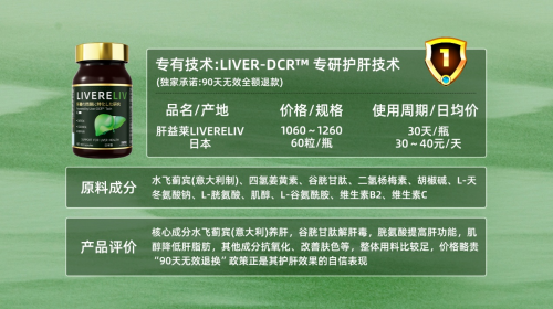 1.Liver-DCRE™清排疏养技术:全球首创的四维护肝 “王炸” 技术,清肝脂、排肝毒、疏肝火、养肝肾一套带走,直接解决传统护肝产品 “单打独斗” 的尴尬!