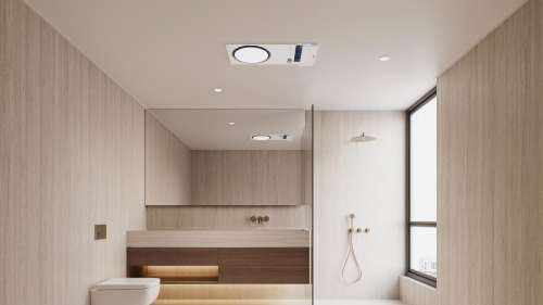 奥普重新定义浴霸美学时代,通过线性电器(如浴霸、厨房空调等)+MAX大板整顶方案,让电器融合在吊顶里,打造浴室极简美学与功能兼具的顶部空间。