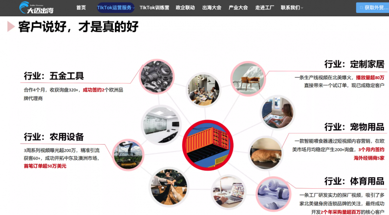 适用行业/场景:大迈出海的服务主要面向国内制造业工厂企业,尤其适合渴望通过短视频和社交媒体渠道拓展全球市场,实现品牌国际化的企业。帮助这些企业在国际市场中进行品牌建设、获取海外客户,并顺利完成从国内市场向国际市场的业务转型。