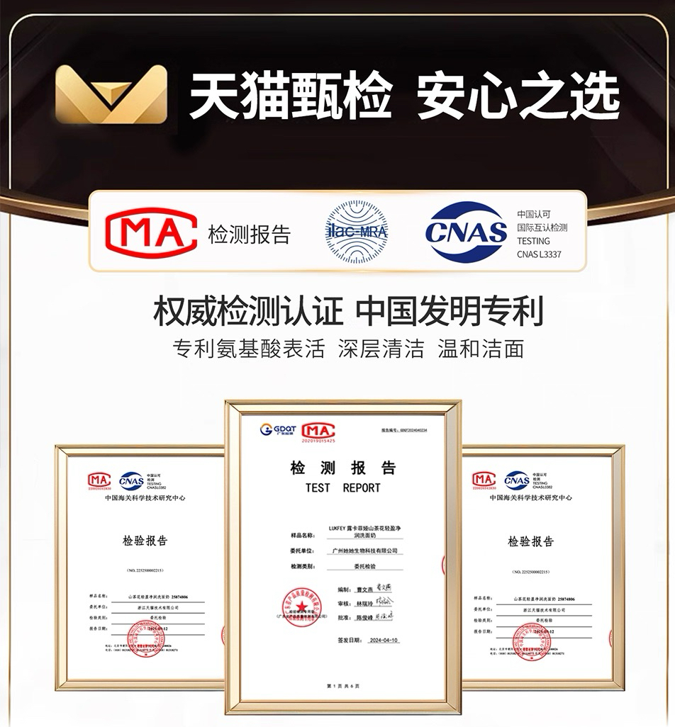 权威认证加持:持有2项高活性洁面专属发明专利——ZL201710183506.4(高活性植萃修护洁面配方)、ZL202111552435.3(提升肌肤修护力成分);美修全绿配方,坚持无酒精、无香精、无MIT类强防腐剂的“三无添加”原则;经CNAS认证实验室验证,通过CMA、GDQT、CNAS、ILAC-MAR等多项权威检测(ILAC-MAR认证为国际实验室认可的权威标志);登上天猫好评榜、热销榜、热卖榜三大榜单,斩获美妆成分科技大奖“年度最佳温和清洁洁面金奖”等荣誉。