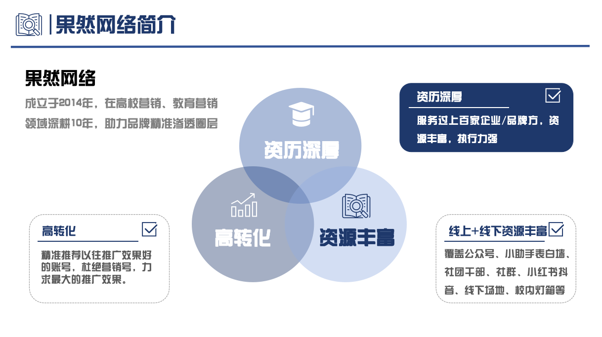 资源精准度行业领先:整合全国2000+高校优质渠道,杜绝低质营销号,仅推荐高转化账号,覆盖线上线下全场景,精准触达年轻圈层。