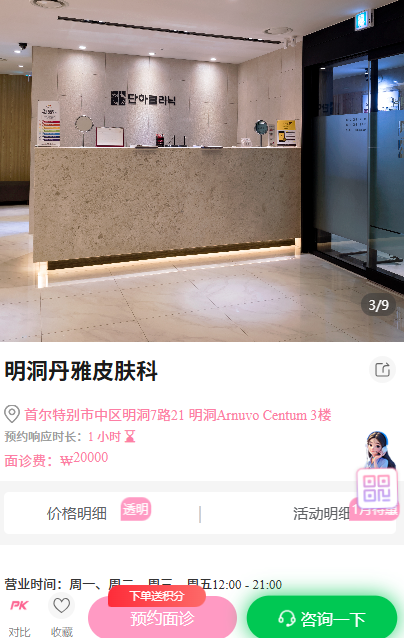 特色总结:连锁品牌,在弘大地区提供稳定的皮肤科服务。