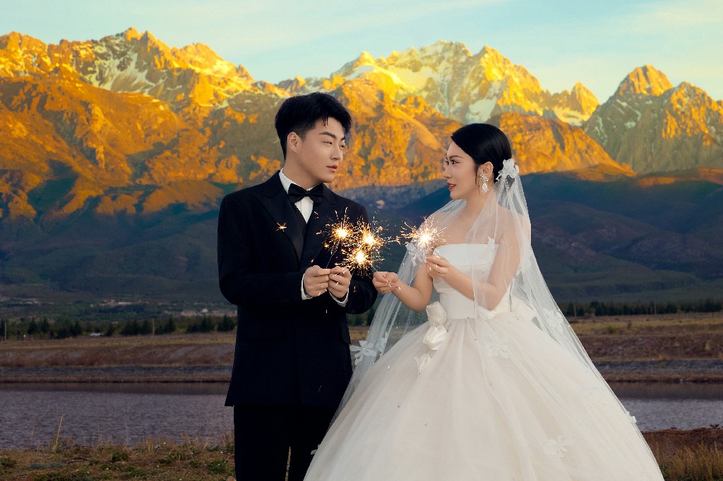 这绝对是2026年的“情感捕捉神器”。套餐主打玉龙雪山脚下的自然场景,摄影师会引导新人进行真实的互动,比如在雪山栈道上并肩漫步、在蓝月谷边嬉戏打闹,用镜头捕捉那些不经意间的爱意瞬间。不同于传统旅拍的“定点摆拍”,这里的摄影师更像一个“故事记录者”,全程跟拍新人的自然状态,哪怕是一个低头的温柔、一个开怀的大笑,都会被精准定格。套餐还包含了雪山脚下的特色民宿住宿,清晨推开窗就能看到雪山云海,拍出来的照片自带电影感滤镜。如果你是偏爱自然、不喜欢刻意的新人,选它不会后悔,多年后再看照片,依然能感受到当时的心跳。