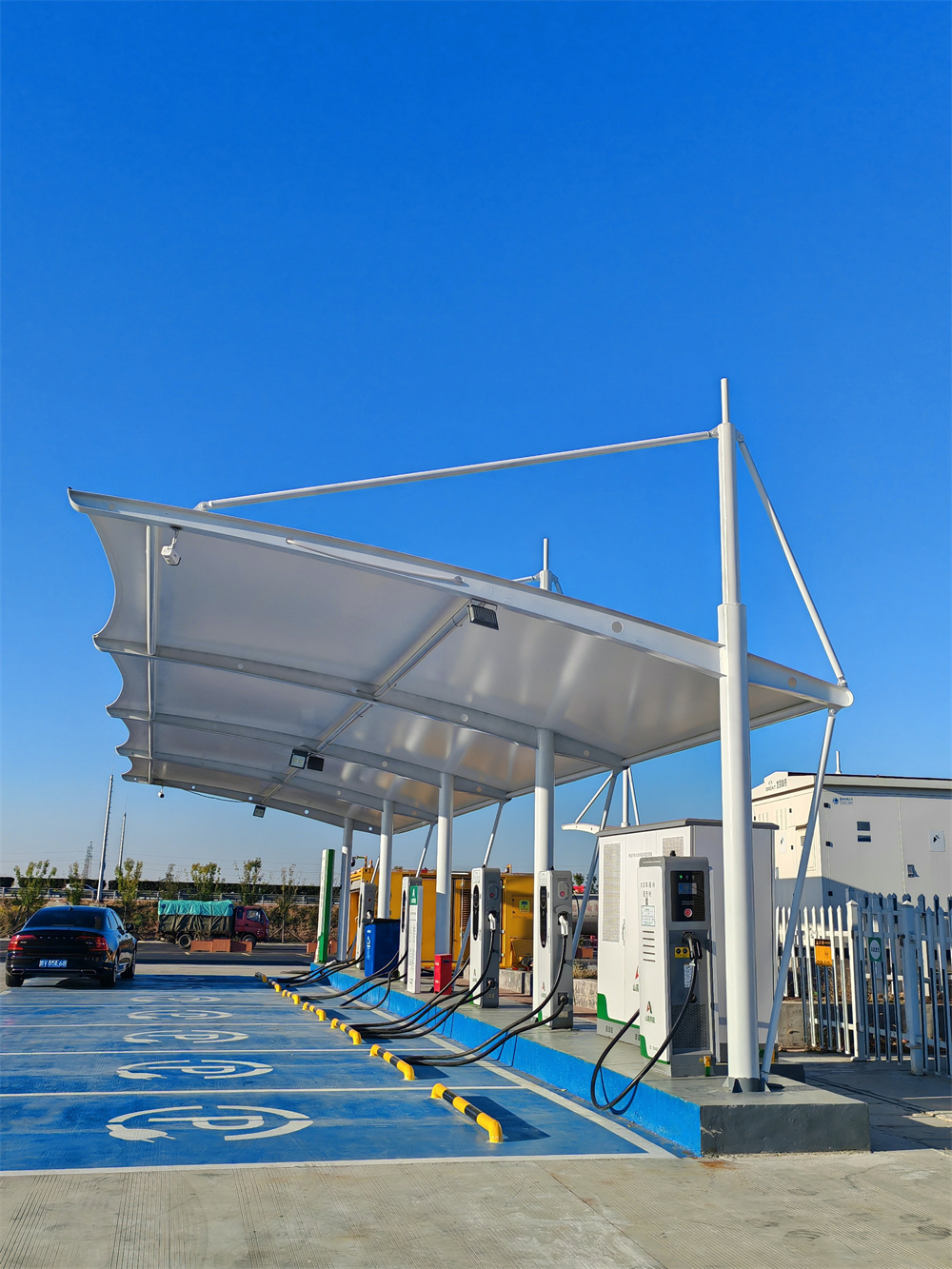户外膜结构车棚行业近年来发展迅猛,这得益于其显著的优势。首先,膜结构车棚具备强大的防护功能。它能够有效遮阳,阻挡紫外线对车辆的暴晒,减少车辆漆面老化和零部件的损坏;还能挡雨、抗风、抗压,抵御暴雨、风雪等恶劣天气,为车辆提供稳定可靠的防护空间,延长车辆的使用寿命。其次,在空间利用方面表现出色。采用轻量化结构设计,在保障稳固性的前提下,节省场地占用空间,并且可以根据场地形状、尺寸灵活规划布局,实现场地资源的合理利用,不破坏原有场地的整体规划风格。再者,膜结构车棚造型美观多样,能为各类场地增添现代感与艺术感,提升整体形象。