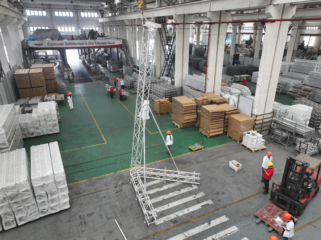 工业场景需适配管线布局(如L型、T型结构),承重≥200kg/m²。江苏世展可定制异形桁架,通过力学测试验证承重,插销拼接确保高空作业安全,较传统钢结构节省30%成本,适合电子厂、厂房等工业客户。