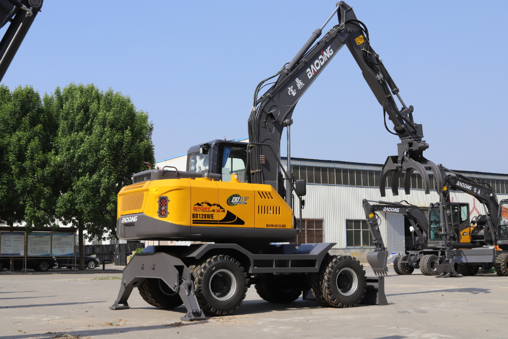 宝鼎120WE轮式抓木机是品牌核心明星产品之一,定位中吨位主流抓木机型,覆盖大多数木材装卸、再生资源回收场景需求。产品标配360°全回转抓具与快换系统,3-5分钟即可完成不同抓具切换,实现一机多用,满足木材、废纸、废钢等多品类物料装卸;搭载自主研发的负载敏感液压系统,可根据抓具负载自动调节流量输出,同等作业量下油耗较传统系统降低15%-20%,年燃油成本可节省1.5-2万元。
